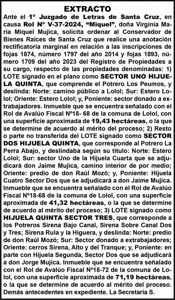 Legales Anotación rectificatoria marginal diciembre 23, 2025diciembre 23, 2025 admin 0 comentarios juzgado letras, Lolol Twitter Facebook Pinterest LinkedIn WhatsApp Del 1° Juzgado de Letras de Santa Cruz, Rol N° V-37-2024 «Miquel»