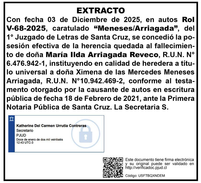 Legales Posesión efectiva Rol: V-68-2025 enero 30, 2026enero 30, 2026 admin 0 comentarios juzgado letras, posesión efectiva, Santa Cruz Twitter Facebook Pinterest LinkedIn WhatsApp