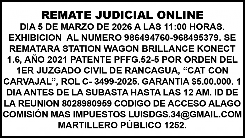 Legales Remate Judicial febrero 27, 2026febrero 28, 2026 admin 0 comentarios 1er juzgado civil, rancagua Twitter Facebook Pinterest LinkedIn WhatsApp Rol C-3499-2025 «Cat con Carvajal»