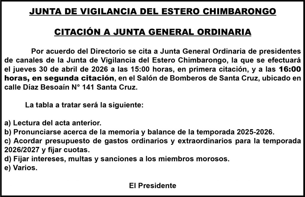 Legales Citación a Junta General Ordinaria abril 14, 2026abril 14, 2026 admin 0 comentarios canales Twitter Facebook Pinterest LinkedIn WhatsApp