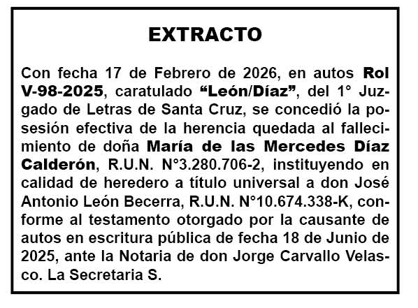 Legales Posesión Efectiva abril 18, 2026abril 17, 2026 admin 0 comentarios juzgado letras Twitter Facebook Pinterest LinkedIn WhatsApp Autos Rol V-98-2025, caratulado “León/Díaz”