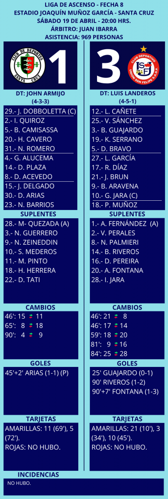 Hay derrotas que duelen más que otras. No solo por el resultado, sino por la forma. Y lo ocurrido en el Estadio Joaquín Muñoz García dejó esa sensación en Deportes Santa Cruz, que cayó por 3-1 ante Unión San Felipe por la octava fecha de la Liga de Ascenso 2026. Ante 969 espectadores y con cerca de 50 hinchas visitantes, el conjunto santacruzano mostró desde el inicio su intención de ser protagonista. Con un 63% de posesión y 26 aproximaciones al arco, el equipo dirigido por John Armijo asumió el control del partido, pero volvió a evidenciar una de las principales falencias de su temporada: la falta de eficacia en el último tercio.