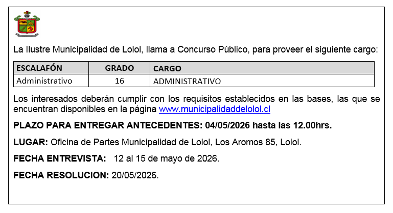 Legales Concurso Público abril 21, 2026abril 21, 2026 admin 0 comentarios Lolol Twitter Facebook Pinterest LinkedIn WhatsApp La Ilustre Municipalidad de Lolol llama a Concurso Público